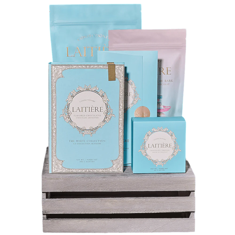 Satisfy your sweet tooth with the Absolute Chocolate Smorgasbord Gift Basket from Connecticut Baskets. Indulge in a decadent array of chocolates including rainbow chocolate bark, dark chocolate bars, white chocolate caramel popcorn, a dark chocolate bar, chocolate truffles, and a wooden gift crate.