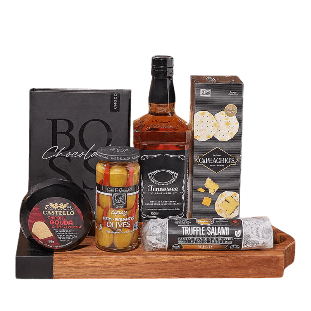 Elevate your next gathering or surprise someone special with the Salami, Cheese & Liquor Board from Connecticut Baskets. This opulent gift is filled with decadent gourmet delights fit for royalty. Indulge in a bottle of liquor, crackers, chipotle gouda cheese, truffle salami, tipsy fiery olives, a box of chocolate bars, and a lovely wooden serving board.